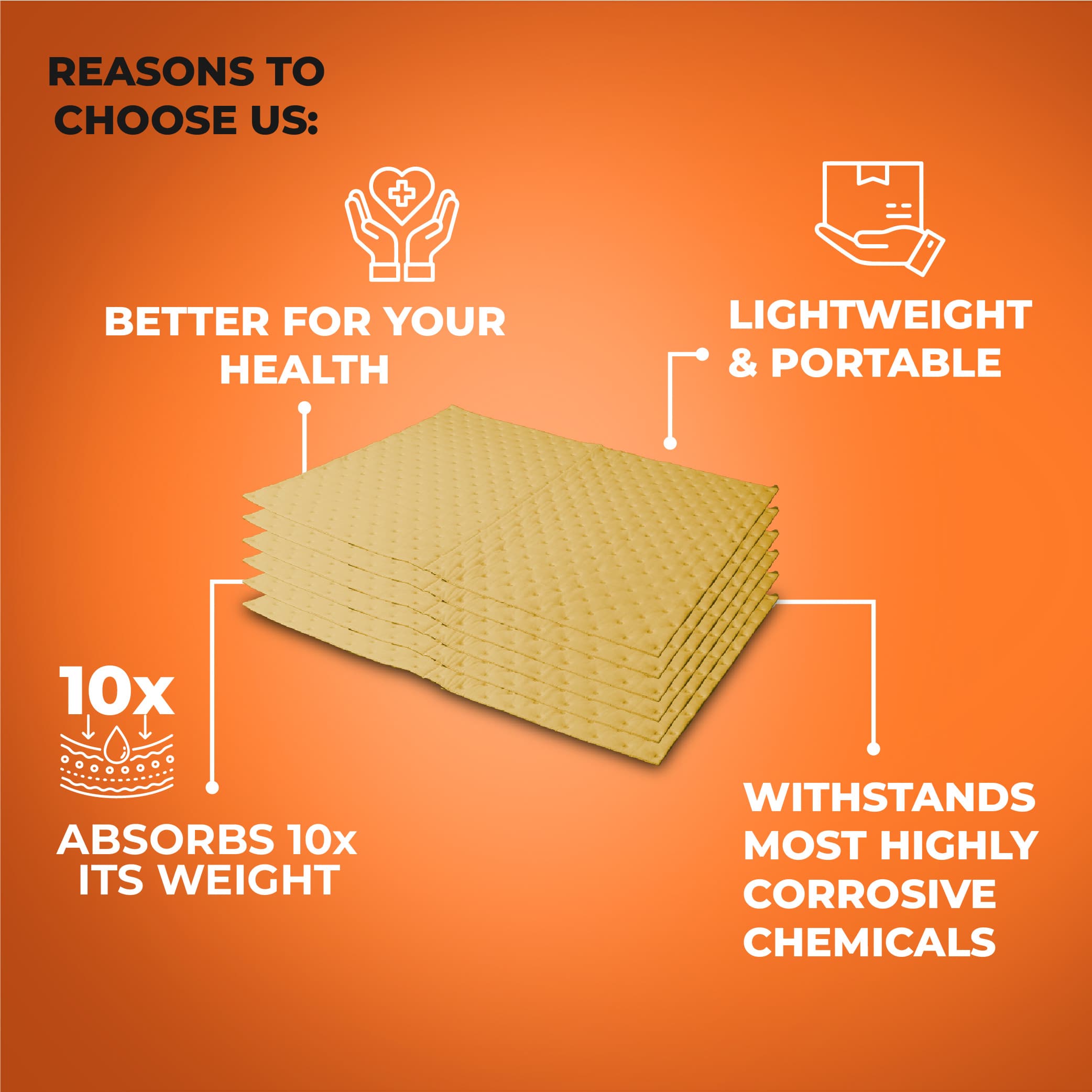 Professional chemical absorbent pads for hazardous material spill cleanup. Absorbs acids, bases, and aggressive chemicals safely and effectively.